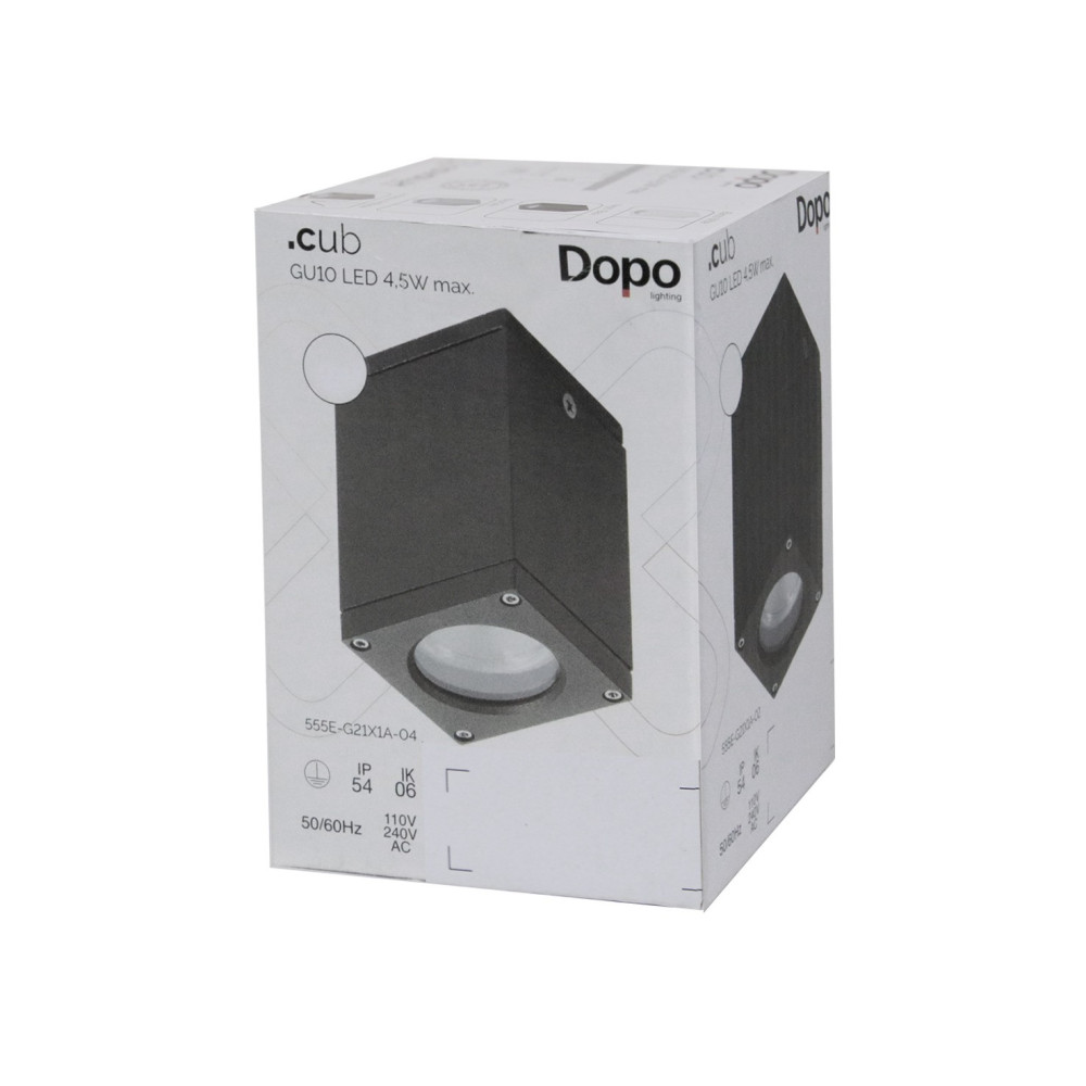 Lámpara plafón modelo CUB. Cuerpo fabricado en aluminio y difusor de cristal matizado. Acabado en gris. Grado de protección IP54 y aislamiento de clase I. Preparada para bombillas LED con casquillo GU10.