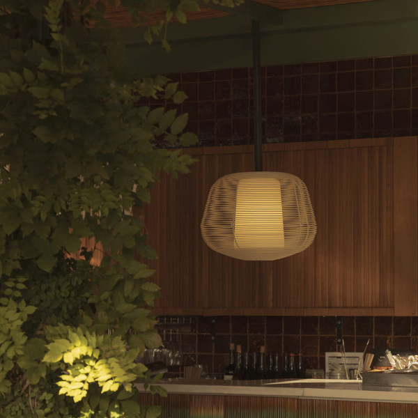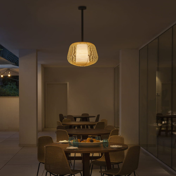 Perfecta para iluminar terrazas, jardines y crear ambientes acogedores al aire libre. Gracias a su diseño, que permite el anclaje de manera fija, sin tensores, hace que sea una colgante más robusta y resistente en ambientes desfavorables.