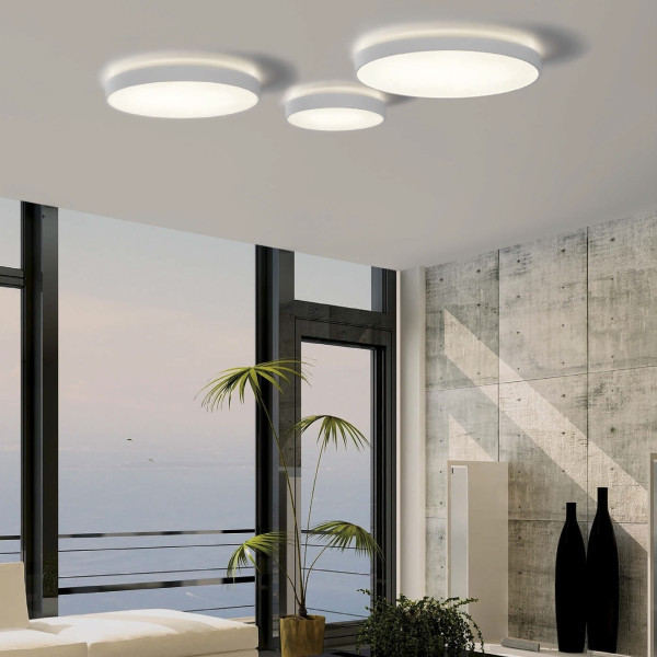 Plafón de techo LED blanco para iluminación interior con dos fuentes de luz independientes. Fabricado en metal con difusor acrílico.