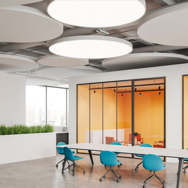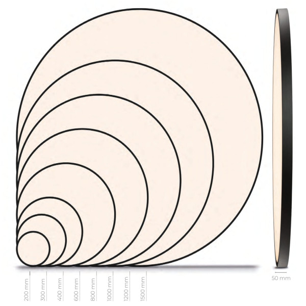 Colección de plafones LED disponibles desde 20 centímetros de diámetro hasta 150 centímetros. Fabricados en metal acabado en blanco o negro texturado con difusor acrílico anti-deslumbramientos.