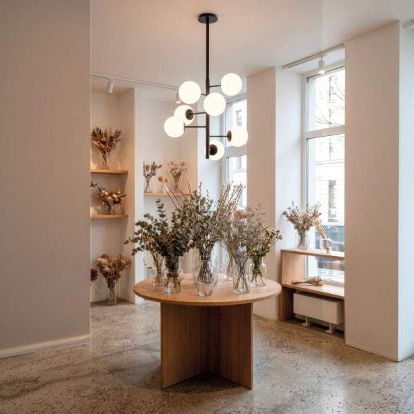 PARMA es una estructura de plafón de techo de siete luces. Fabricado en metal con acabado negro mate.