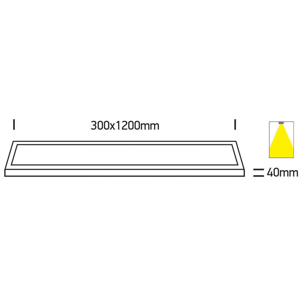 Plafón rectangular blanco LED 300x1200mm. Funciona con LED integrado de 40W de potencia y luz de color cálida (3000K).