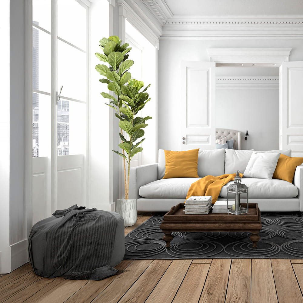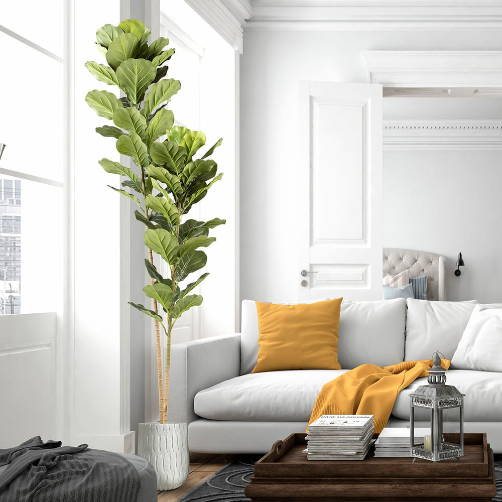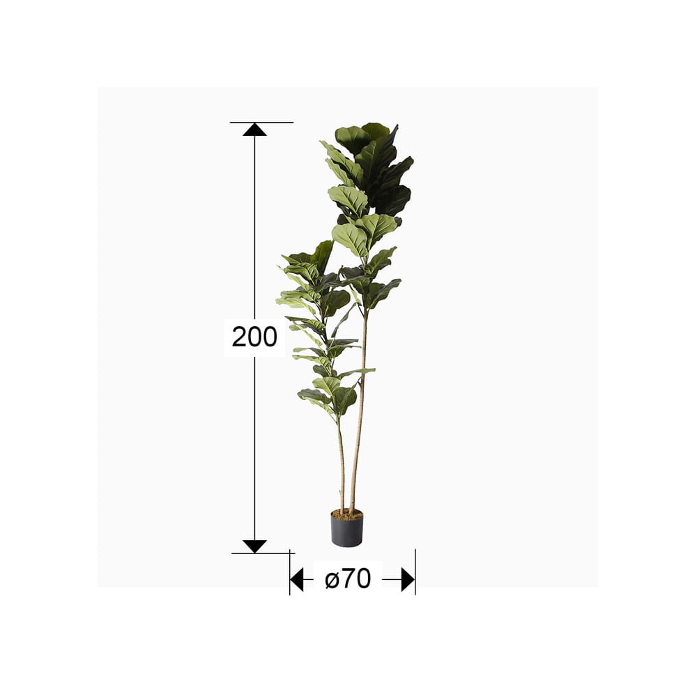 Ficus lyrata o higuera de violín, planta artificial realizada en PVC y metal. Incluye base de cemento y maceta (Ø17 x 15 cm).