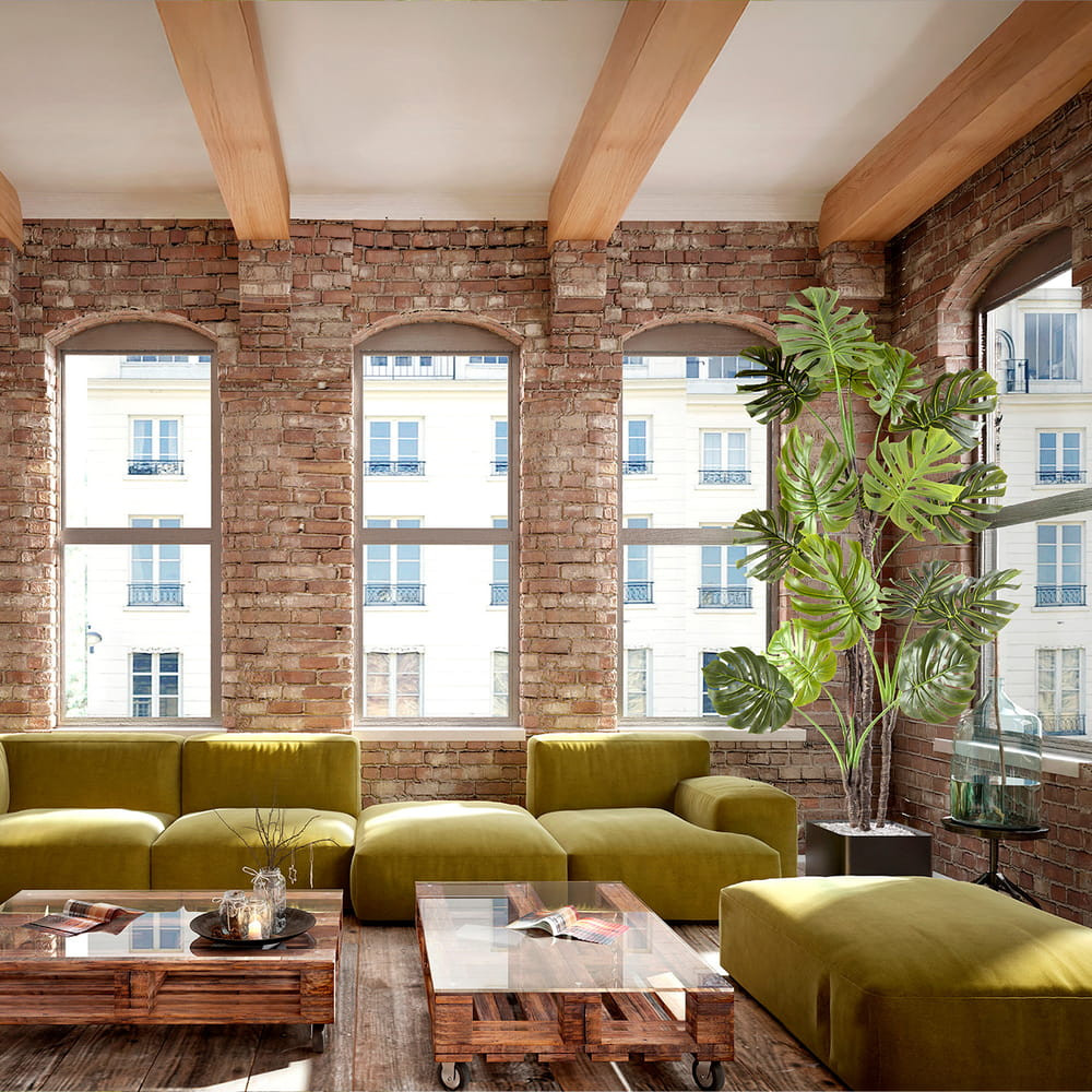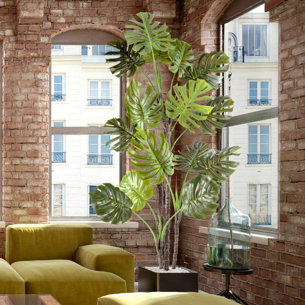 Planta artificial realizada en PVC y metal. Incluye base de cemento con musgo artificial y maceta (Ø19 x 18 cm).