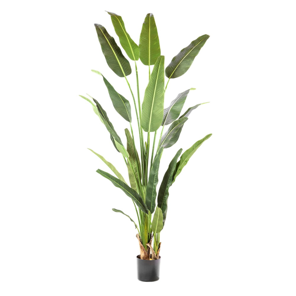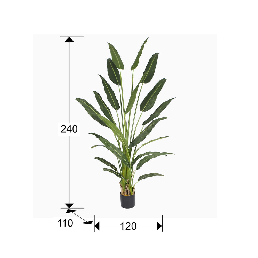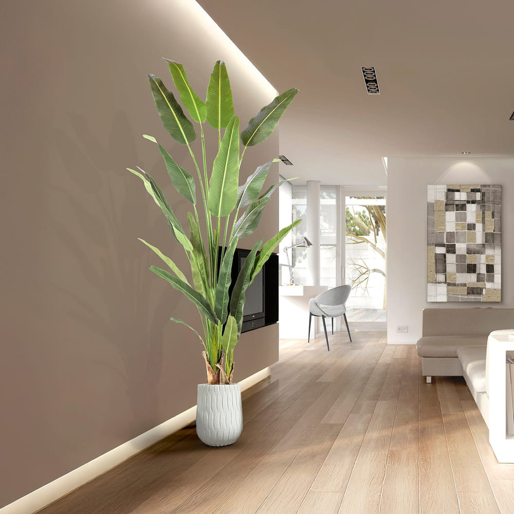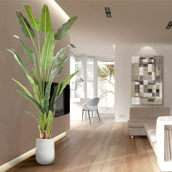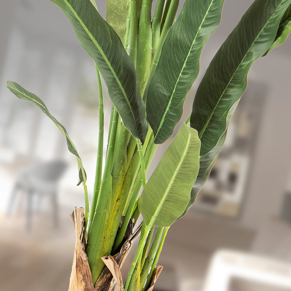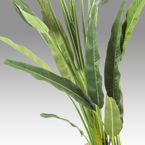 Ravenala madagascariensis o Palma Viajero, planta artificial realizada en PVC y metal. Incluye base de cemento con musgo artificial y maceta (Ø19 x 18 cm).