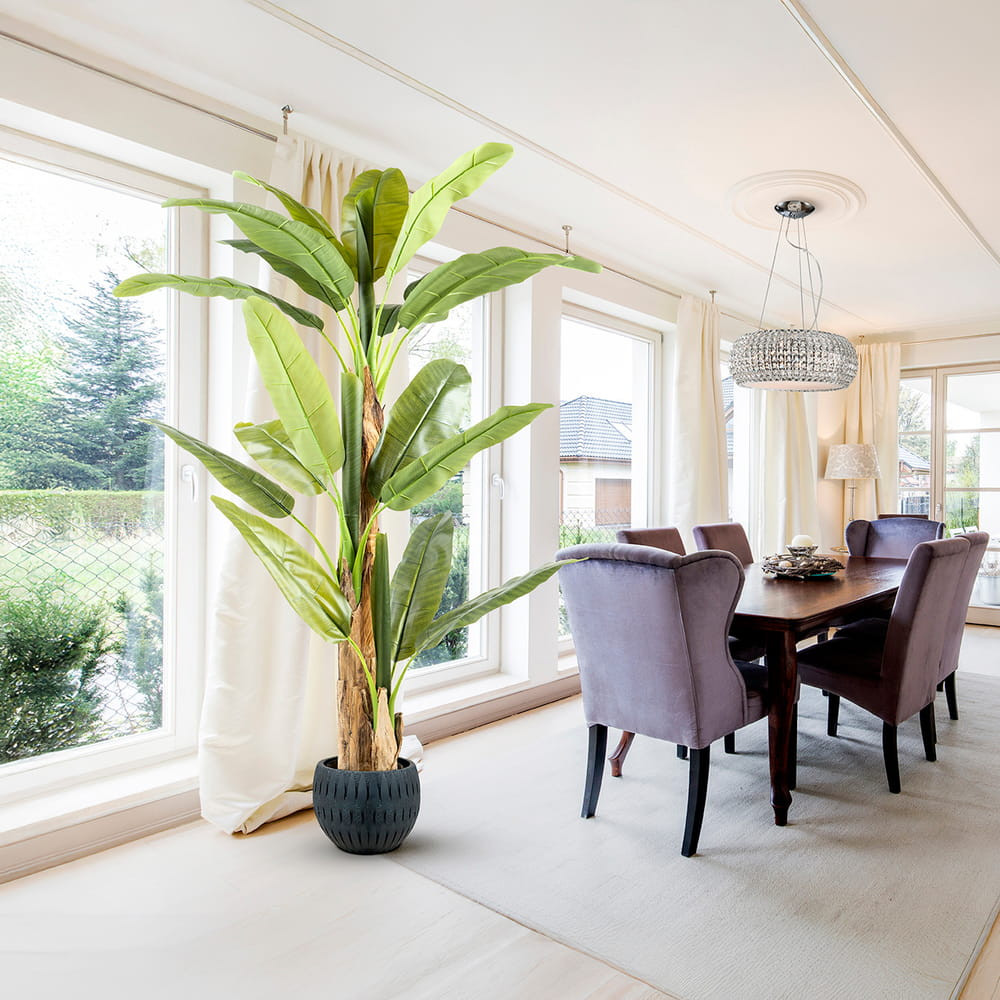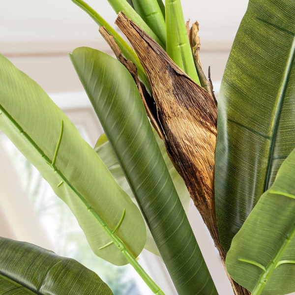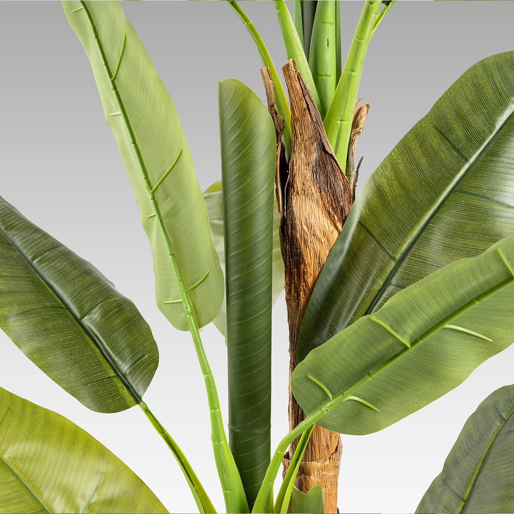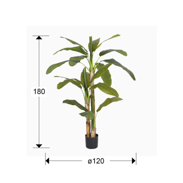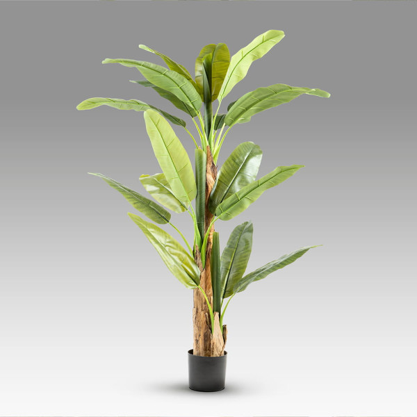 Musa paradisíaca o platanera, planta artificial realizada en PVC y metal. Incluye base de cemento y maceta (Ø19 x 18cm).