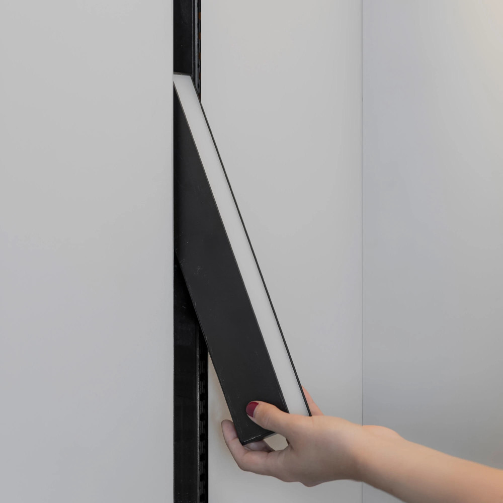 NESO LINE es una luminaria de la familia NESO de color negro. Se añade a los carriles con el sistema magnético. Mide 32cm. El sistema DALI permite regular la intensidad de la luz.