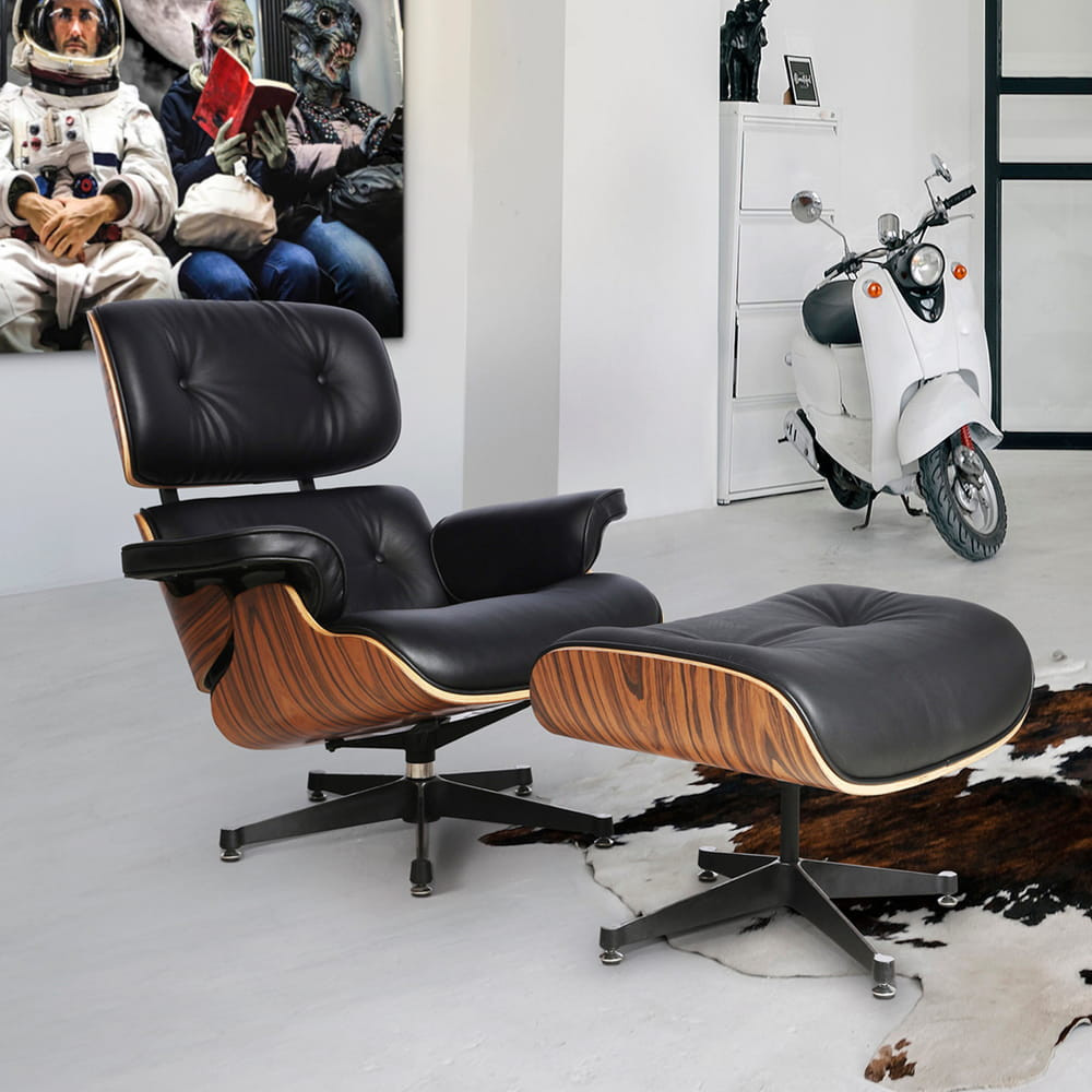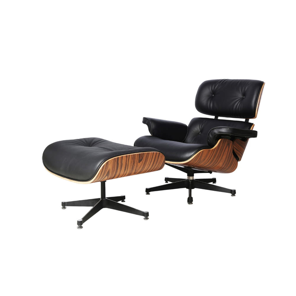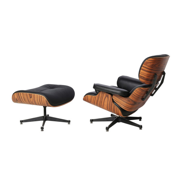 Chaise longue "EAMES", conjunto de sillón y reposapiés. Estructura de contrachapado curvado, acabado en palisandro, con asiento tapizado en piel negra y patas en aluminio acabado negro.