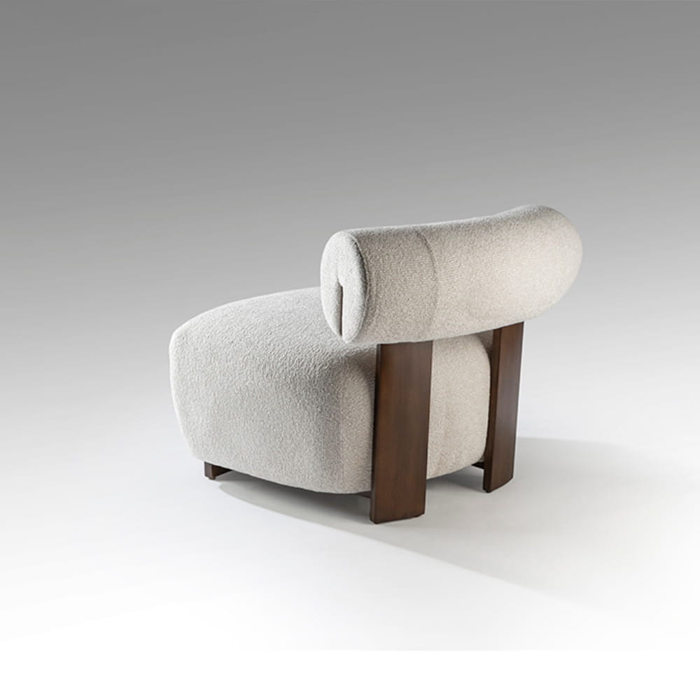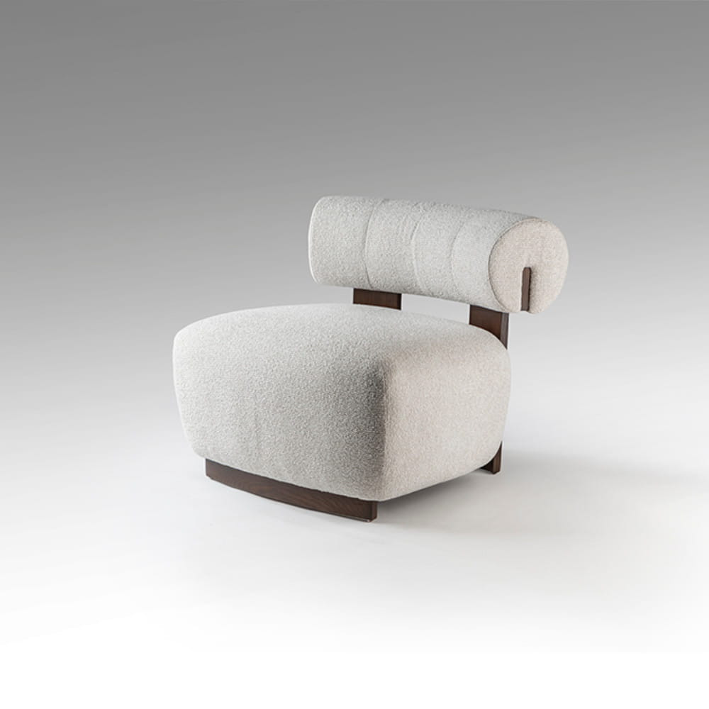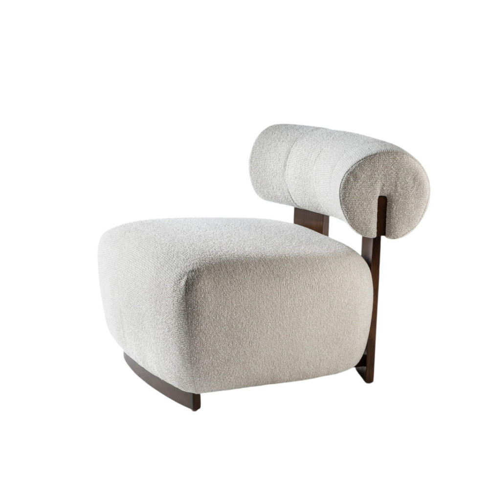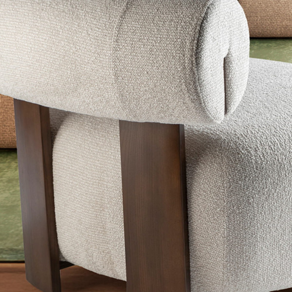 Butaca realizada en madera acabado nogal y tapizado en chenilla crudo.