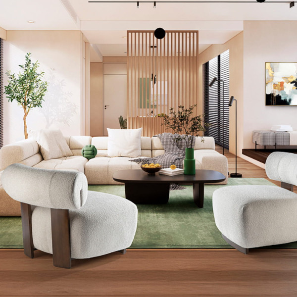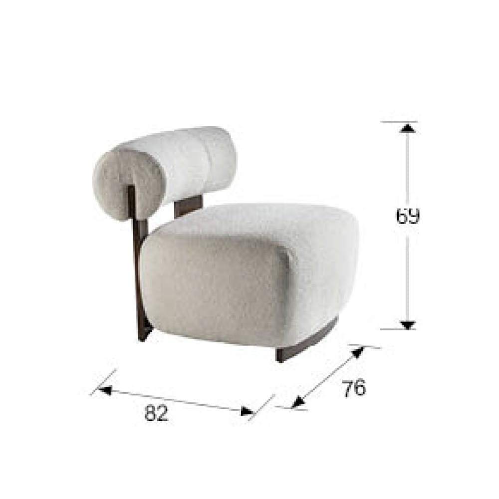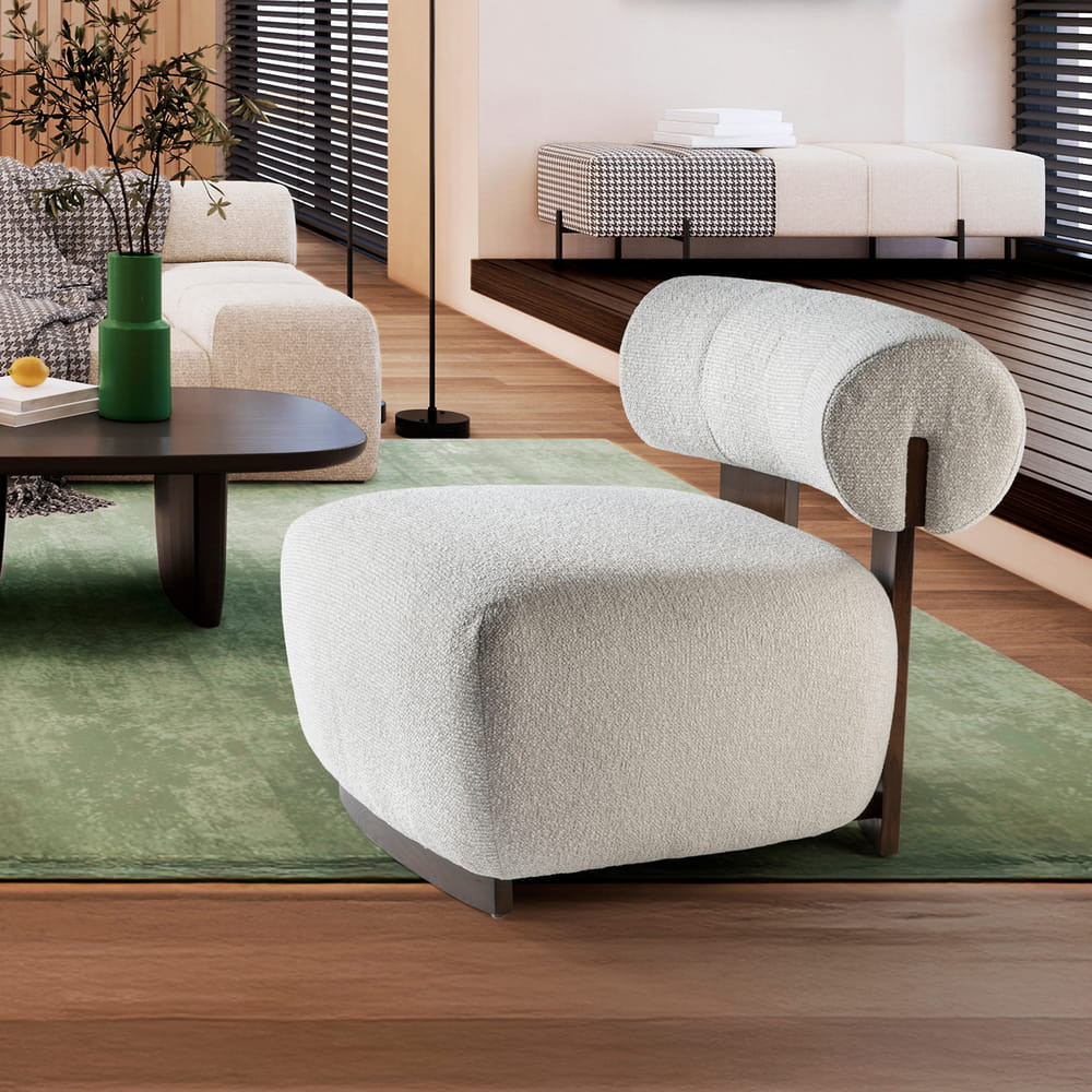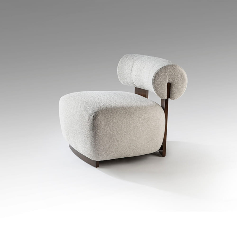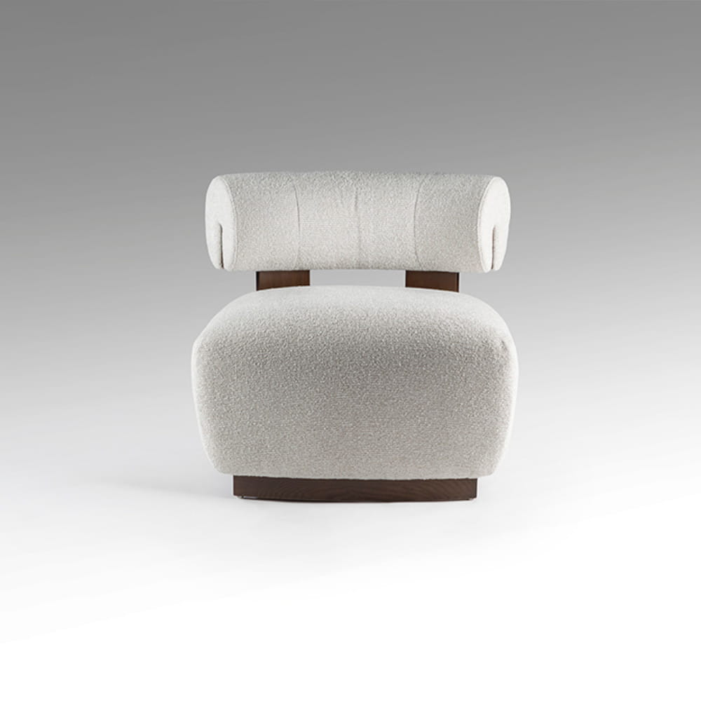 Butaca realizada en madera acabado nogal y tapizado en chenilla crudo.