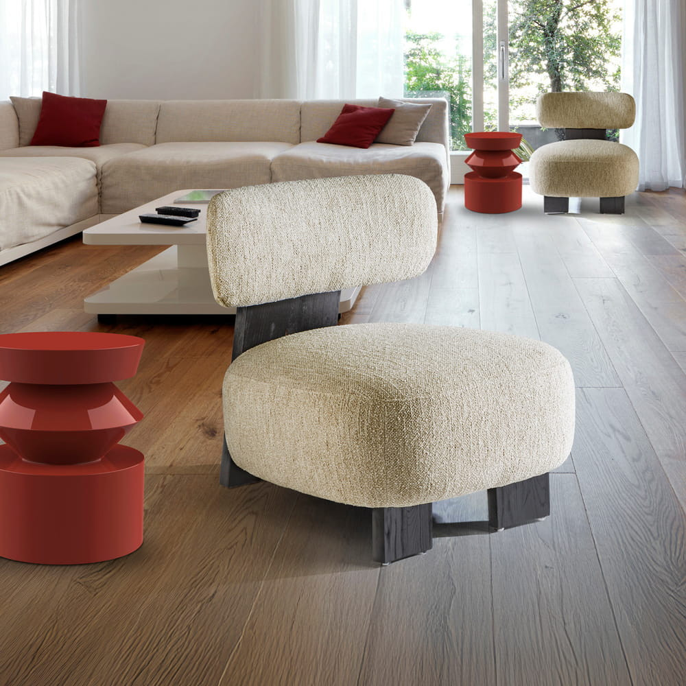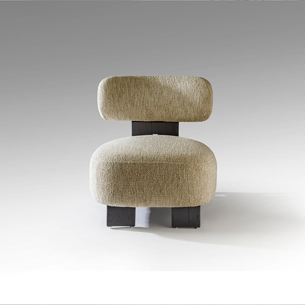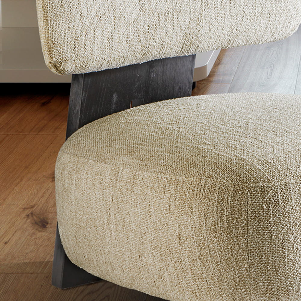 Butaca realizada en madera acabado negro y tapizado en chenilla crudo jaspeado.