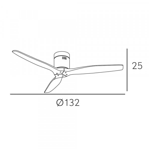 Ventilador AGUILON sin luz incorporada, realizado en metal y madera, en color BLANCO con tres aspas. Motor DC. Tiene cinco velocidades ajustables. Su medida es de 25X132X132 centímetros. Control de aire verano o invierno. Mando a distancia INCLUIDO con TEMPORIZADOR 1/4/8 H. Modelo también disponible en Níquel-Haya, marrón-roble y en Cuero-Roble.