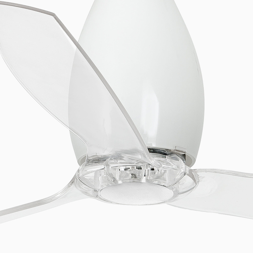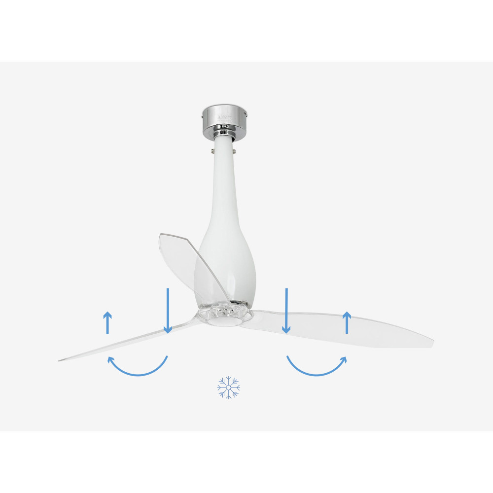 ETERFAN blanco brillo/transparente de ETERFAN, un ventilador de estilo industrial y muy actual. Este ventilador de techo moderno es ideal para estancias a partir de 17m2. Accionado por mando a distancia, incluido. Este ventilador de techo con motor DC de bajo consumo, dispone de 6 velocidades regulables con un consumo de 4-6-9-13-22-32W y 51-77-103-129-155-185 revoluciones por minuto según velocidad. ETERFAN tiene función inversa verano-invierno, por lo que podrá utilizarlo también en invierno mejorando la eficiencia de su sistema de calefacción. Caudal de aire: 145,66 m3 min / 5144 CFM.
