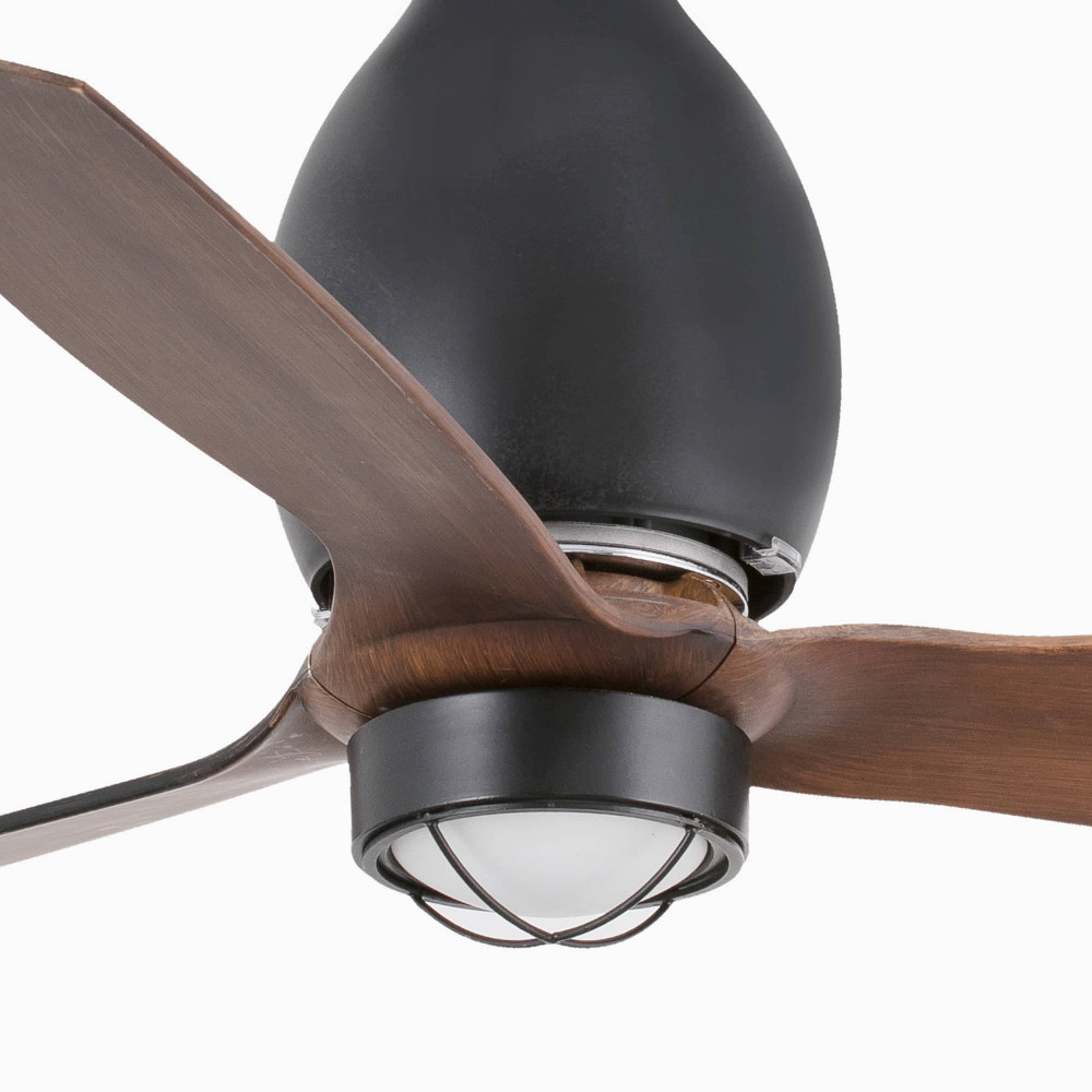 MINI ETERFAN es un ventilador de techo con luz de estilo industrial y muy actual. Es ideal para estancias desde 13m2 hasta 17'6m2 y cuenta con motor DC de bajo consumo. Dispone de 6 velocidades regulables con un consumo de 3-6-9-13-22-32W y 51-77-103-129-155-185 revoluciones por minuto según velocidad. Este ventilador con acabado negro mate y palas de madera tiene función inversa, por lo que podrá utilizarlo también en invierno mejorando la eficiencia de su sistema de calefacción. Accionado por mando a distancia incluido.