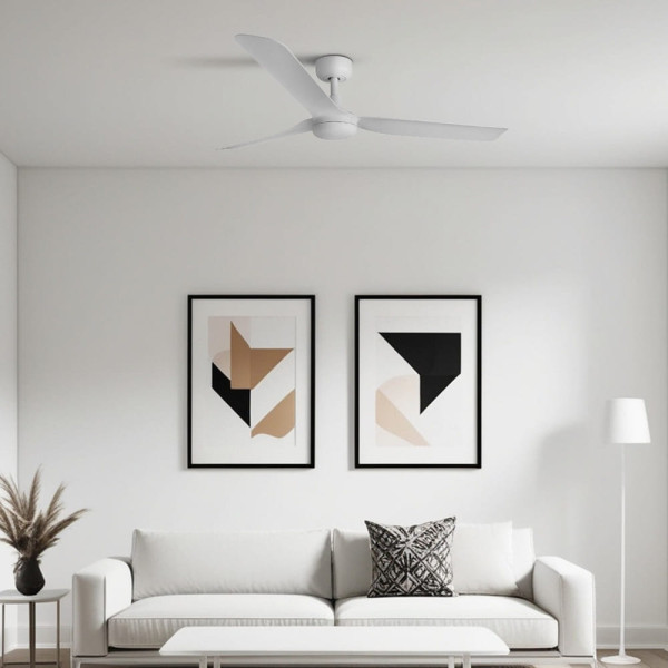 PUNT es un ventilador de techo de color blanco con palas blancas para espacios de entre 17,6m2 y 28m2. Accionado por mando a distancia con programador, incluido. Este ventilador de techo con motor DC de bajo consumo, dispone de 6 velocidades regulables. PUNT tiene función inversa verano-invierno, por lo que podrá utilizarlo también en invierno mejorando la eficiencia de su sistema de calefacción. Apto para techo inclinado.