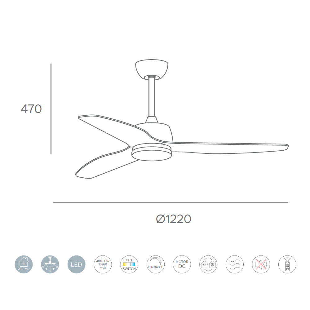 El ventilador de techo con luz LED July cuenta con 3 palas y es completamente silencioso. Incluye un mando a distancia que permite encenderlo y apagarlo, escoger entre 6 velocidades y entre 3 temperaturas de luz: 3000K, 4000K o 6000K.