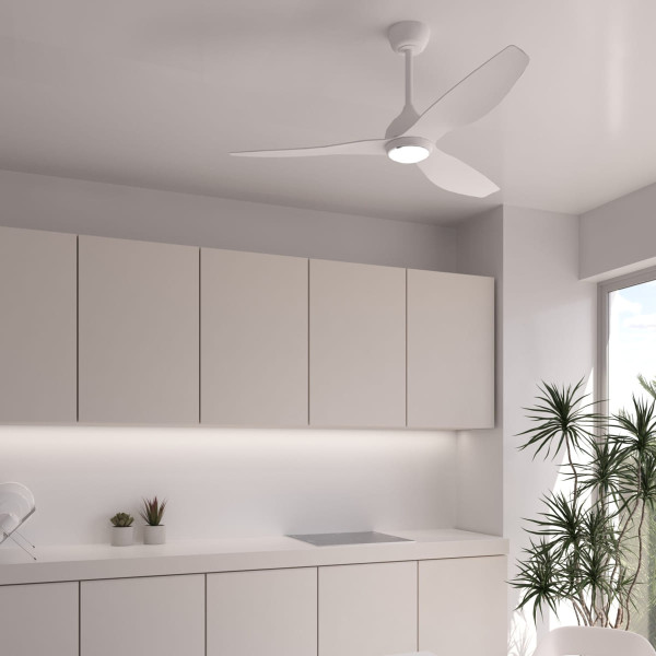 Ventilador de techo Forlight PAM con Motor DC de bajo consumo y alta durabilidad. Ideal para habitaciones de 20 a 30 m2. Súper silencioso. Apto para uso intensivo. Fabricado en acero acabado en color blanco, palas de policarbonato color blanco y difusor acrílico opal. Accionado por mando a distancia incluido. Dispone de 5 velocidades regulables con un consumo de 6-6,8-12-19-35W y 87-107-127-168-204 revoluciones por minuto según velocidad.