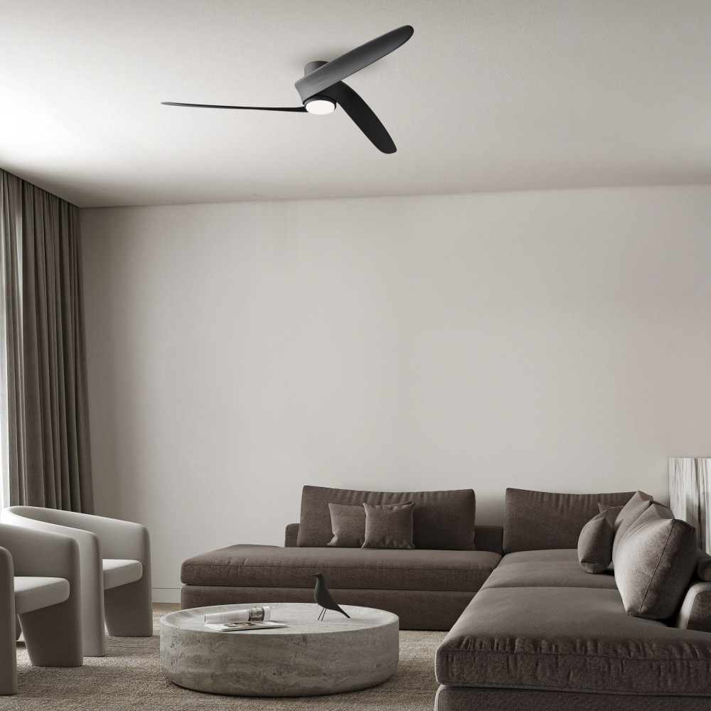 Ventilador de techo LED acabado en negro combina diseño elegante y funcionalidad avanzada para aportar confort y estilo a cualquier espacio interior. Su acabado crea una estética moderna y natural que se integra fácilmente en salones, dormitorios o espacios contemporáneos.