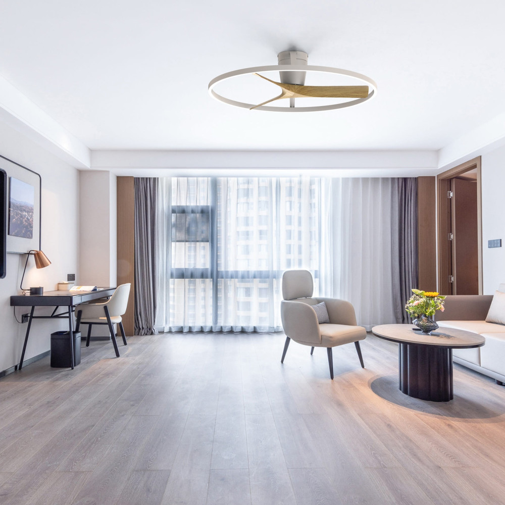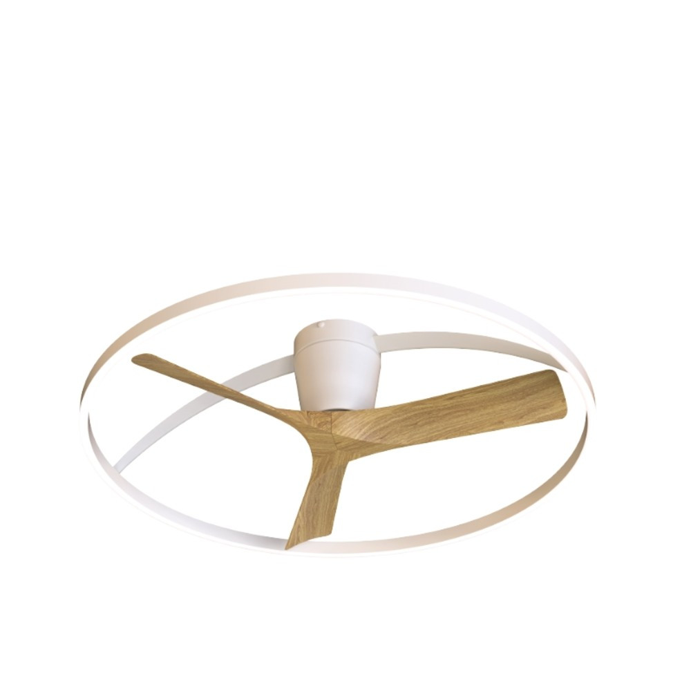 Plafón ventilador blanco y madera con luz LED CCT regulable, motor DC, función inversa y temporizador.