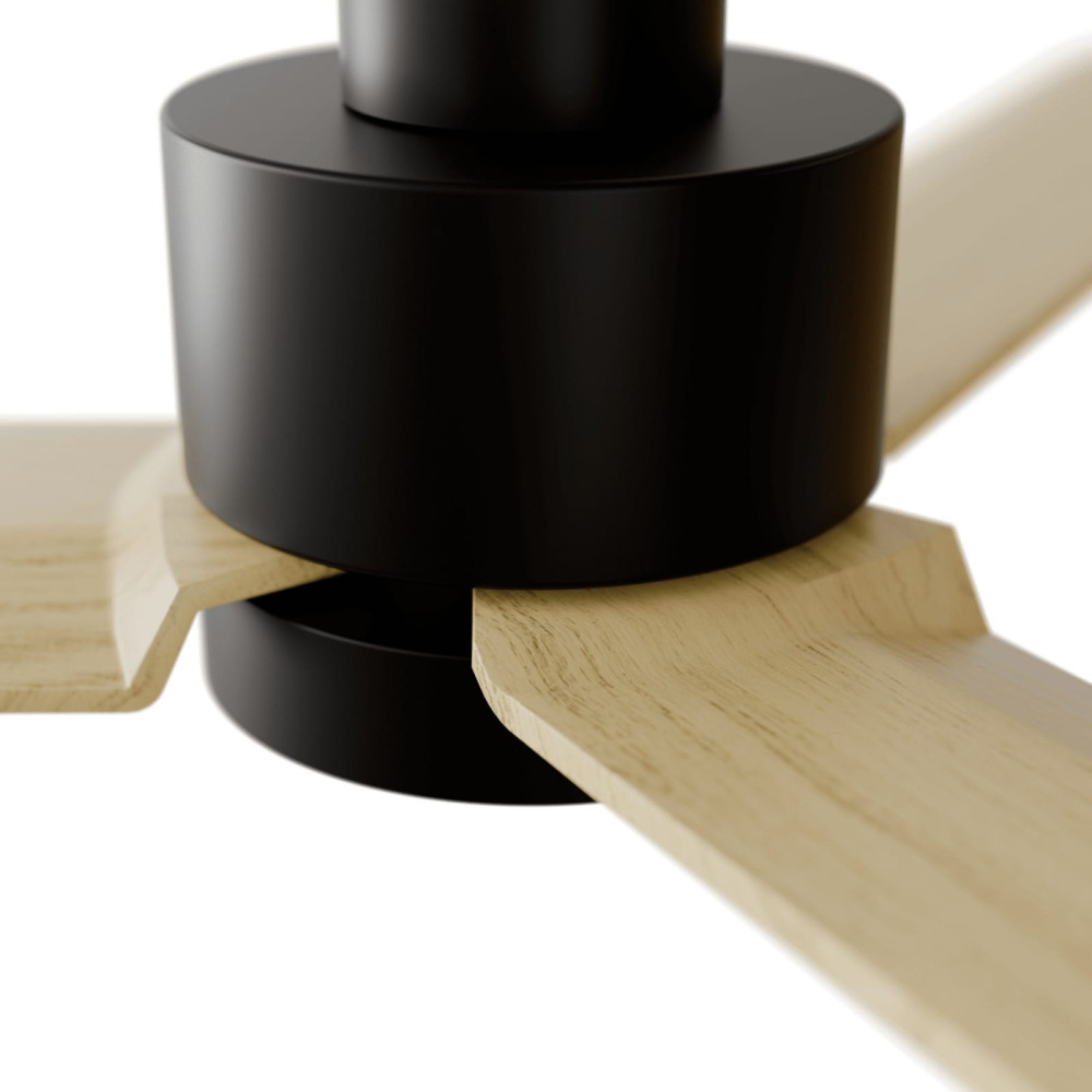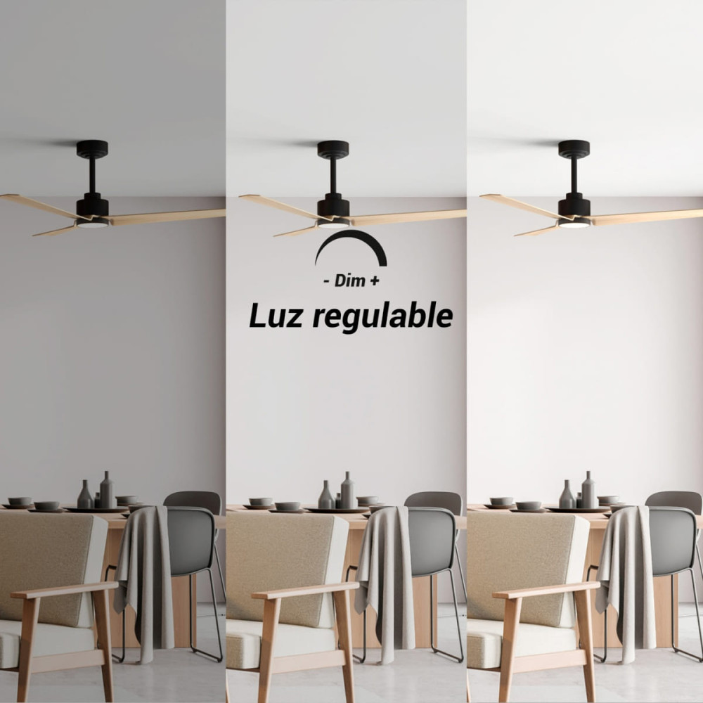 Ventilador negro con palas acabado madera clara de 127cm con luz LED 20W CCT regulable, motor DC y temporizador.