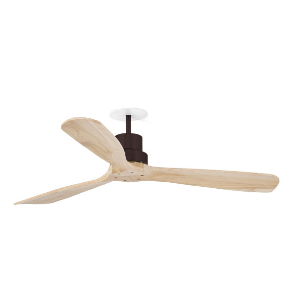 Ventilador de 91cm blanco con aspas madera clara, motor DC, IP44 y luz LED CCT regulable.