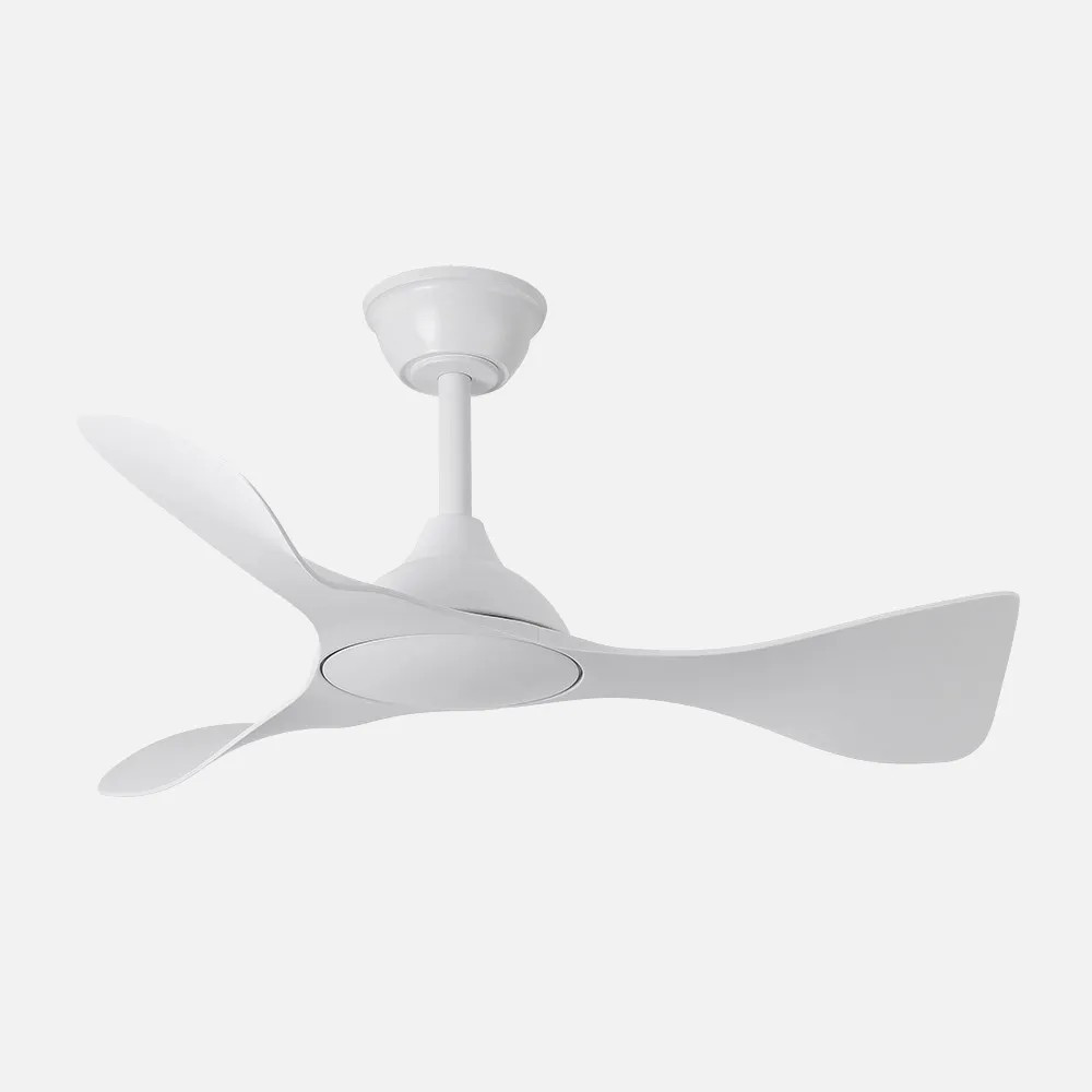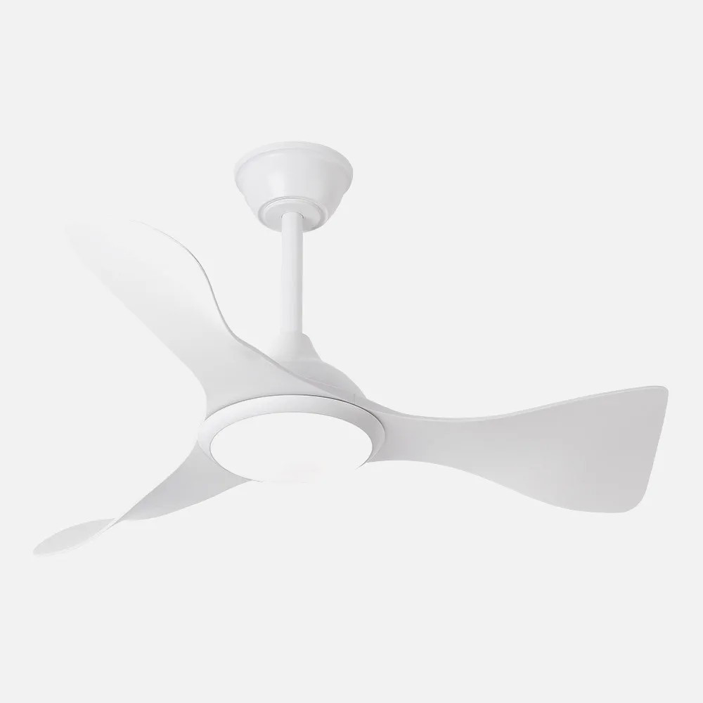 Ventilador DC de la serie CAIMAN realizado en metal, ABS y policarbonato, en color BLANCO con tres aspas de color blanco. Tiene seis velocidades ajustables. Motor DC, con INSTALACION DE LUZ OPCIONAL. Tecnología LED incorporada con una potencia de 36 vatios, con 3 TEMPERATURAS DE LUZ( 3000-4500-6500K) y 3600 lúmenes. De diseño moderno y original. Su medida es de 26/41X89X89 centímetros, con dos tijas de 10 y 25 centímetros para instalar a distintas alturas. Control de aire verano e invierno. REGULABLE EN INTENSIDAD, con mando a distancia INCLUIDO, MEMORIA DE COLOR incorporada y TEMPORIZADOR 1/4/8 H. Su voltaje va de 186 a 265 vatios, lo que resiste en un campo muy amplio a subidas y bajadas de tensión sin sufrir daño alguno. Modelo disponible en negro, blanco, blanco/haya y en negro/roble.