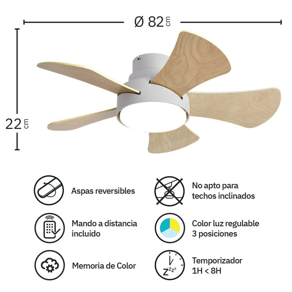 Ventilador DC de la serie GREGARIO de color BLANCO con cinco aspas REVERSIBLES en color BLANCO/HAYA y seis velocidades. Sus dimensiones de 22x82x82 centímetros. Posee Tecnología LED integrado con una potencia de 25 W, 2495 lúmenes y luz seleccionable en 3 posiciones (3000k color blanca cálida, 4000k color blanca neutra, y 6000k color blanca fría), además de memoria de color. Tiene control remoto INCLUIDO con la opción verano/invierno y la opción de temporizador de 1 hasta 8 horas. El cuerpo del ventilador es de metal y cristal, y las aspas de MDF. Disponible también en color Verde-Blanco/Haya y en Gris-Blanco/Haya.