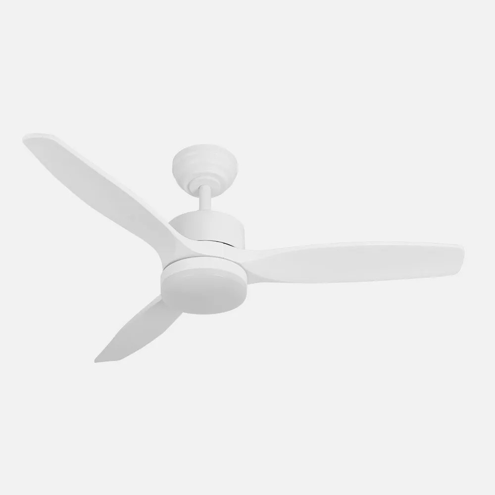 Ventilador DC serie TORINO de color BLANCO con 3 aspas. Realizado en metal, madera y policarbonato. Tiene una medida de 35,3/47,8x107x107 centímetros. Motor DC. Tecnología LED integrada con una potencia de 24W, 2424 lúmenes y COLOR DE LUZ SELECCIONABLE EN 3 TEMPERATURAS (3000-4000-6500K) luz cálida, natural y blanco frío. Dispone de control remoto con 6 velocidades diferentes, memoria de color, modo de verano/invierno y temporizador de 2/4/8 horas. Incluye dos tijas de 12,5 y 25 centímetros para instalar en techos a distintas alturas. Modelo disponible en color blanco y en cuero/roble.