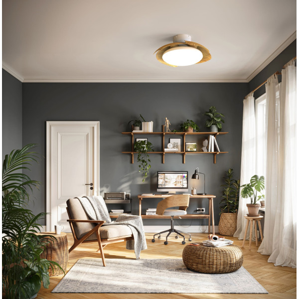 Ventilador de techo blanco y madera con 4 aspas desplegables. LED 40W, 4200lm, CCT y dimmable.