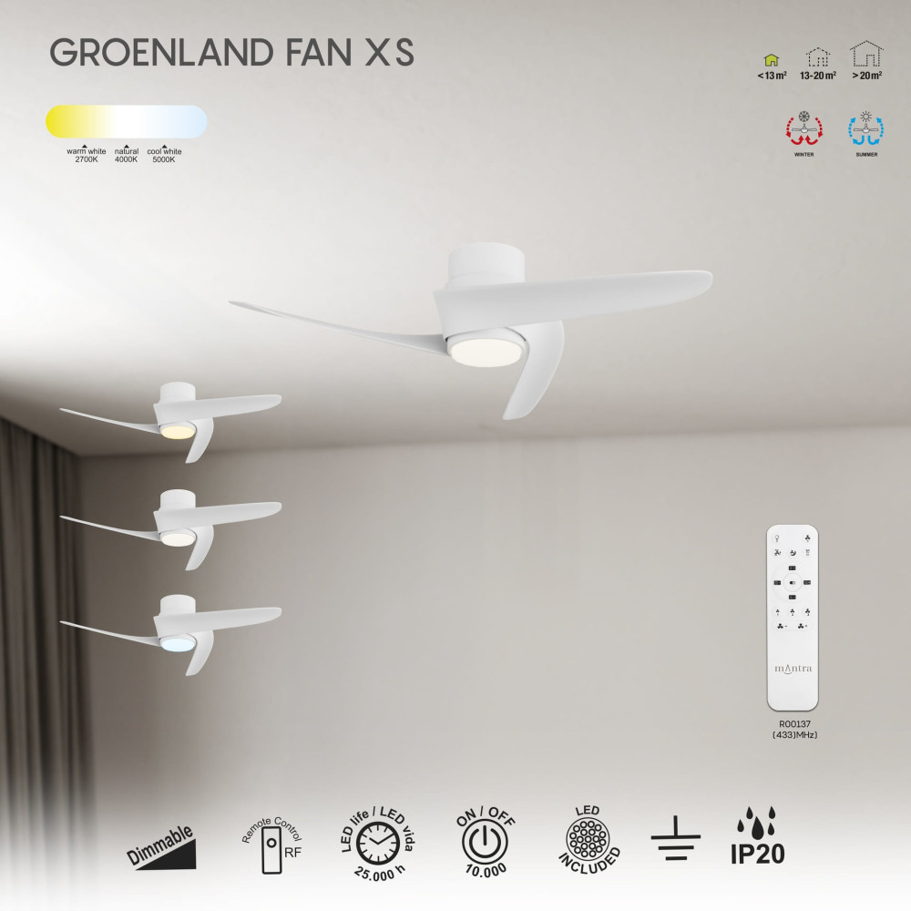 Con un diámetro de 79 cm y una altura de 23,5 cm, ofrece una ventilación eficiente junto con iluminación LED integrada de alta calidad. Incorpora una potencia LED de 24W con un flujo luminoso de 1700 lúmenes y temperatura de color regulable entre 2700K y 5000K, permitiendo adaptar la iluminación desde tonos cálidos hasta neutros según el ambiente deseado.