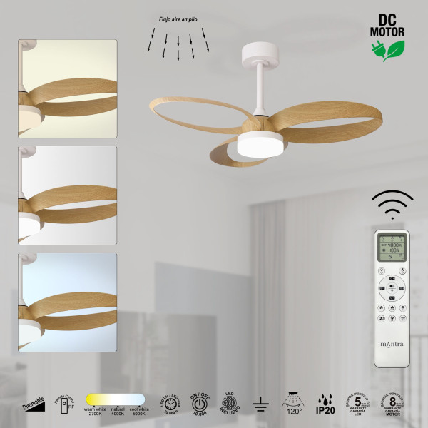 Ventilador de techo LED acabado en blanco y palas en efecto madera combina diseño elegante y funcionalidad avanzada para aportar confort y estilo a cualquier espacio interior. Su acabado crea una estética moderna y natural que se integra fácilmente en salones, dormitorios o espacios contemporáneos.