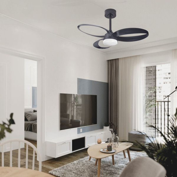 Ventilador de techo LED acabado en negro combina diseño elegante y funcionalidad avanzada para aportar confort y estilo a cualquier espacio interior. Su acabado crea una estética moderna y natural que se integra fácilmente en salones, dormitorios o espacios contemporáneos.