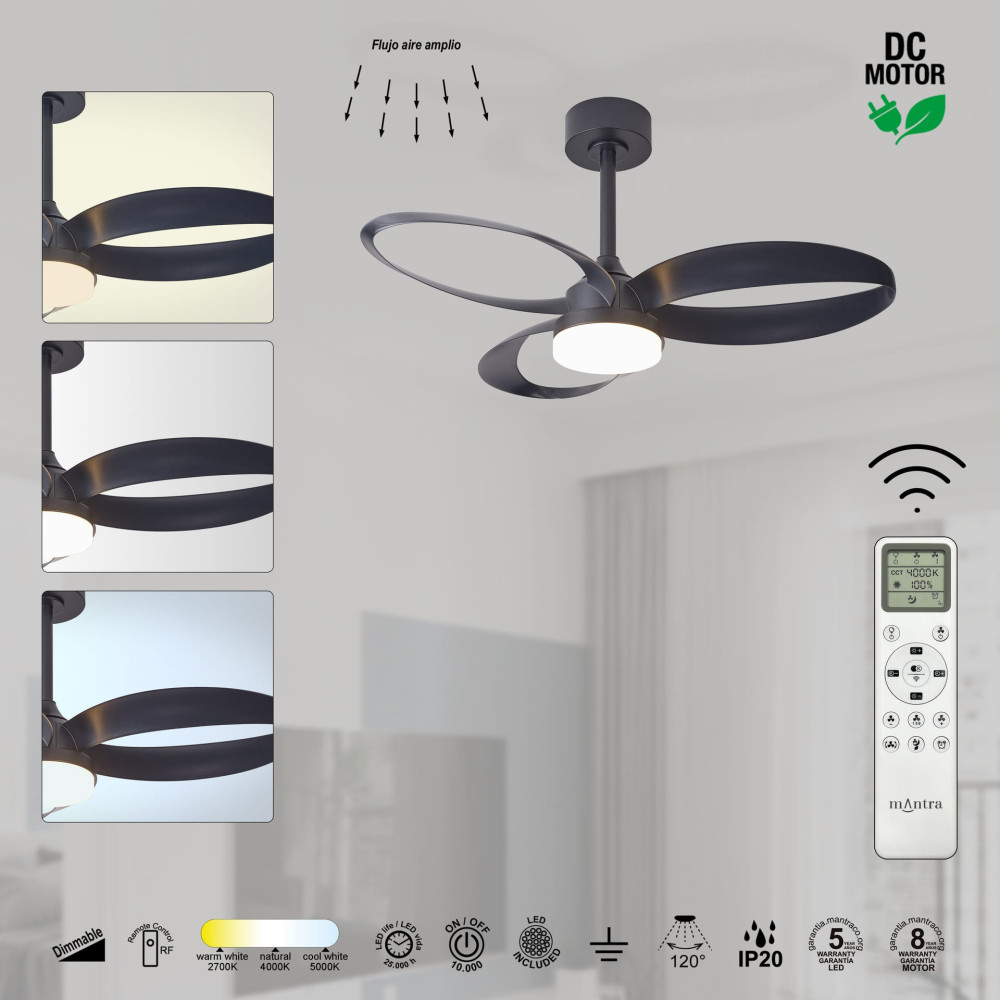 Con un diámetro de 92,5cm y una altura de máxima de 43,5 cm, ofrece una ventilación eficiente junto con iluminación LED integrada de alta calidad. Incorpora una potencia LED de 20W con un flujo luminoso de 2520 lúmenes y temperatura de color regulable entre 3000K y 5000K, permitiendo adaptar la iluminación desde tonos cálidos hasta neutros según el ambiente deseado.