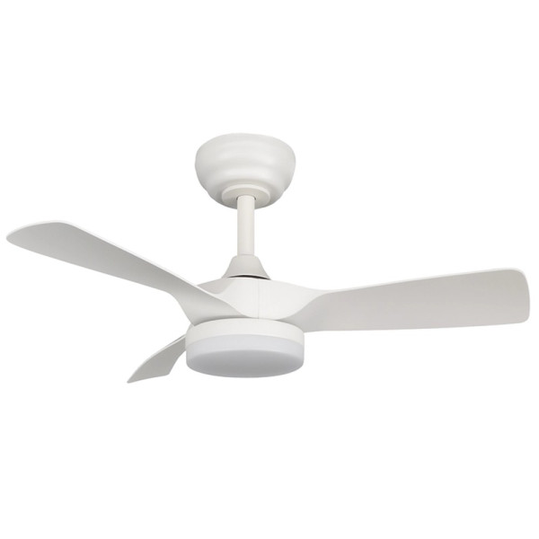 Ventilador de 91cm blanco mate con motor DC, IP44 y luz LED CCT regulable.