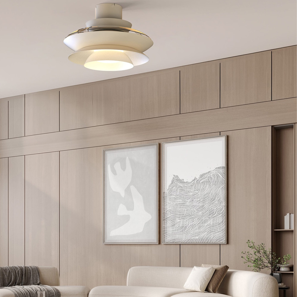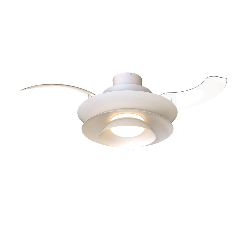 Plafón ventilador blanco mate con luz LED CCT regulable, motor DC, función inversa y temporizador.