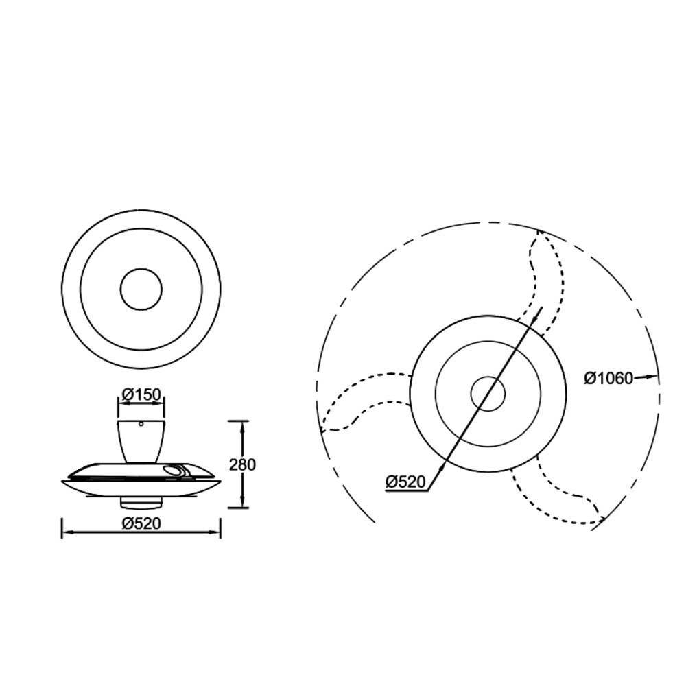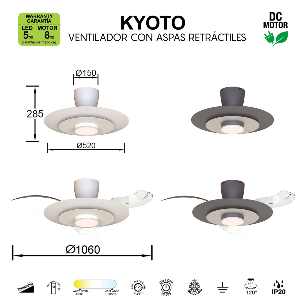 Mantra presenta el modelo KYOTO con 20W de potencia LED y 2520 lúmenes. Con una potencia motor de 30W con 250rpm. Su tamaño es de 50cm cerrado y 106cm de diámetro una vez desplega sus aspas, altura desde techo de 25cm.