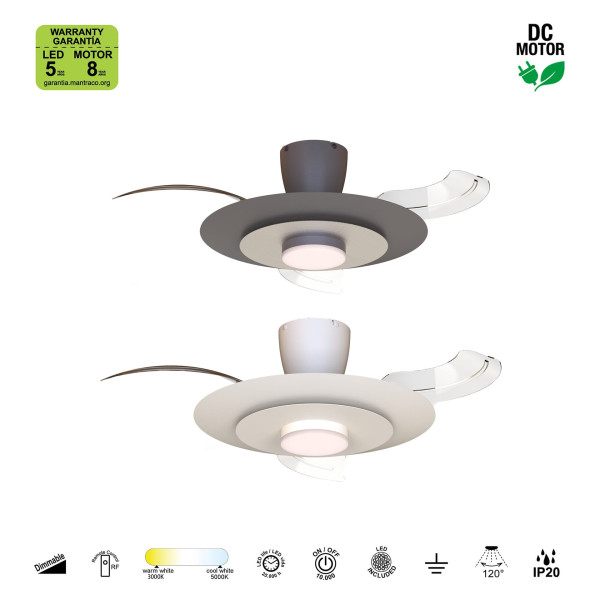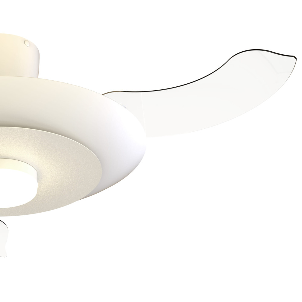 Plafón ventilador blanco mate con luz LED CCT regulable, motor DC, función inversa y temporizador.